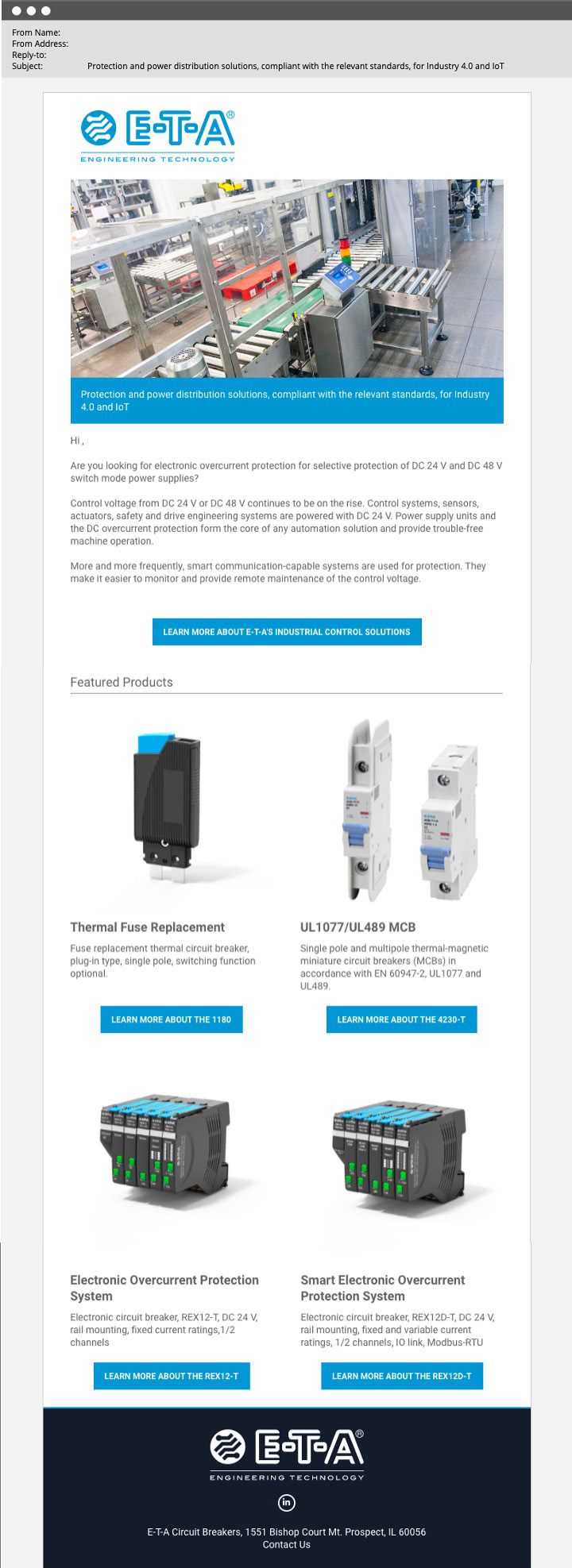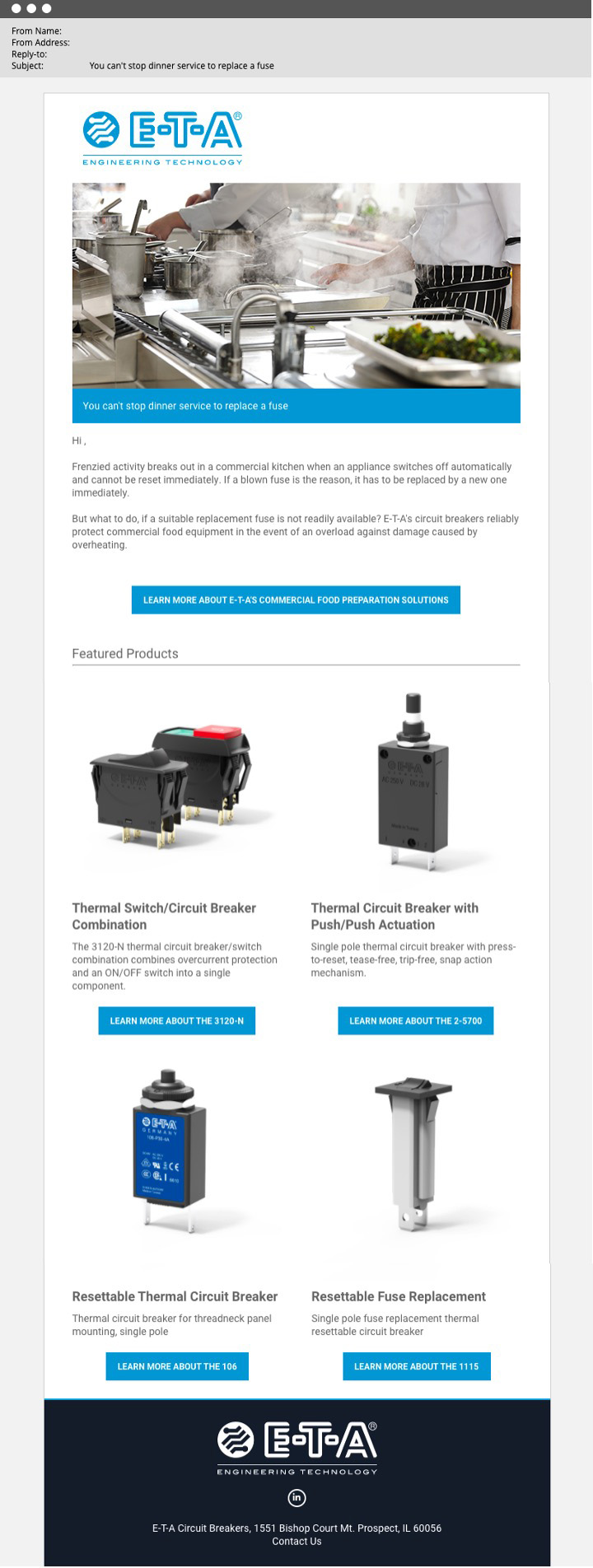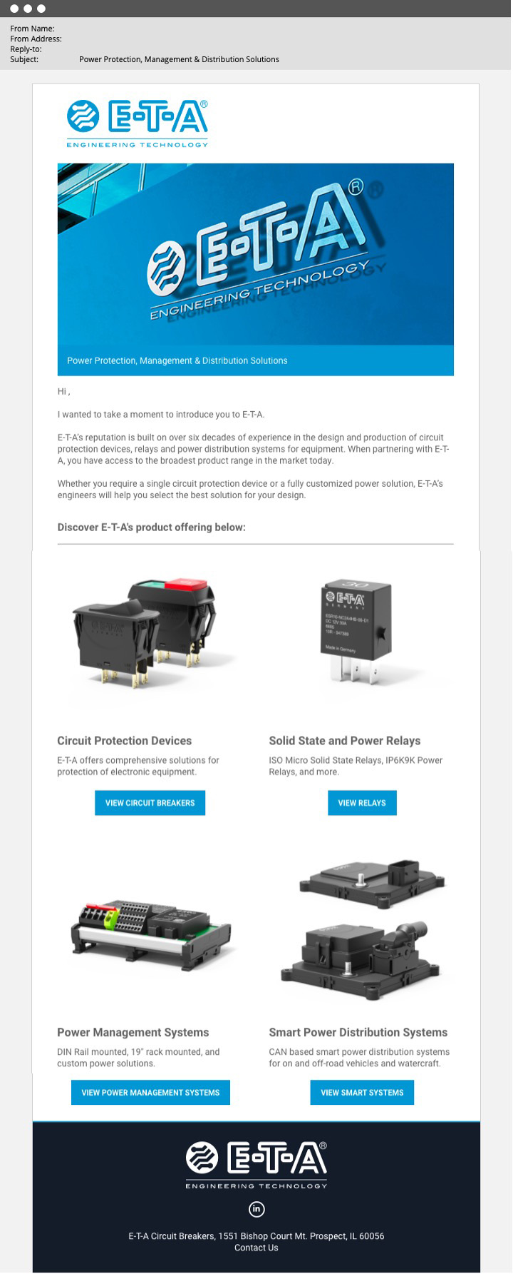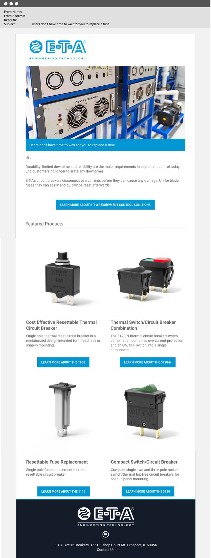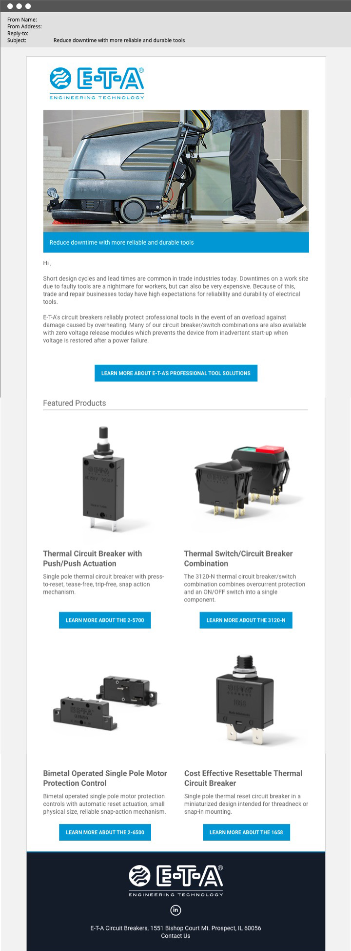 E-T-A offers standard industry specific email that you can send to your contacts. Just fill in the form to the right and an E-T-A branded email promoting industry specific products and content will be sent to your contact. The following emails are available. Click on the thumbnails below to see an example of each email.
