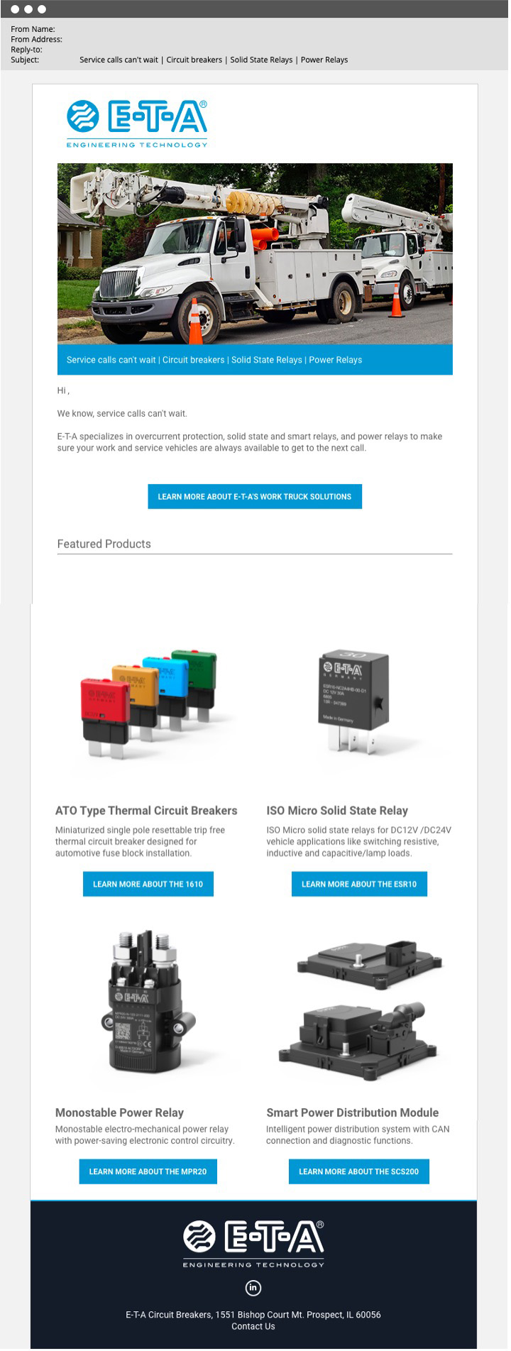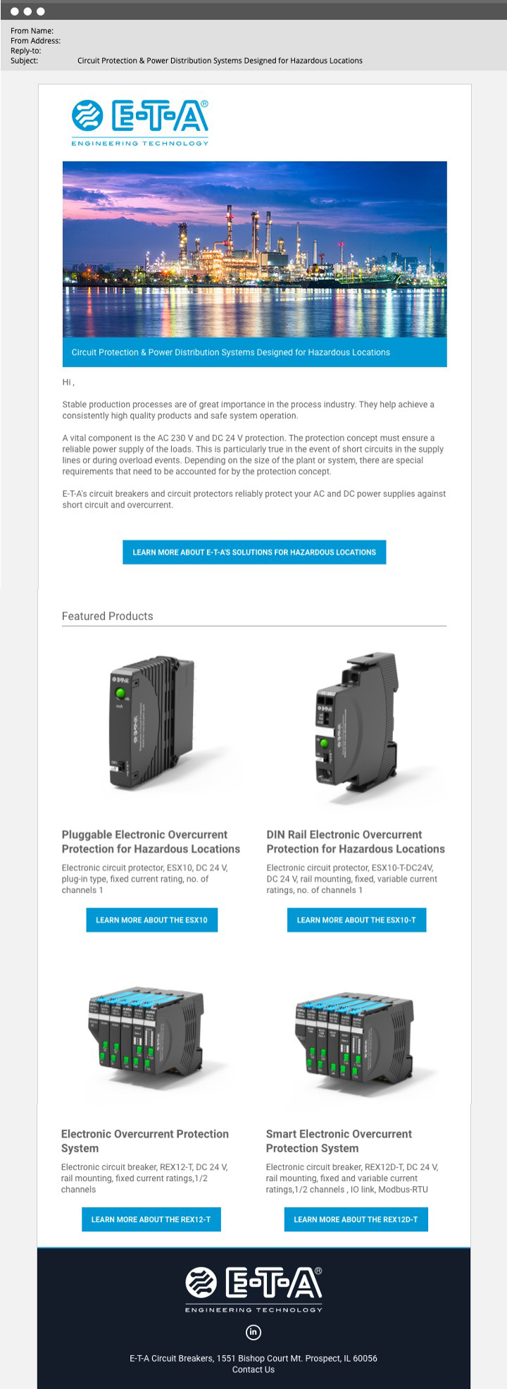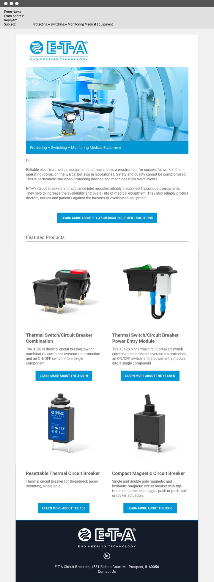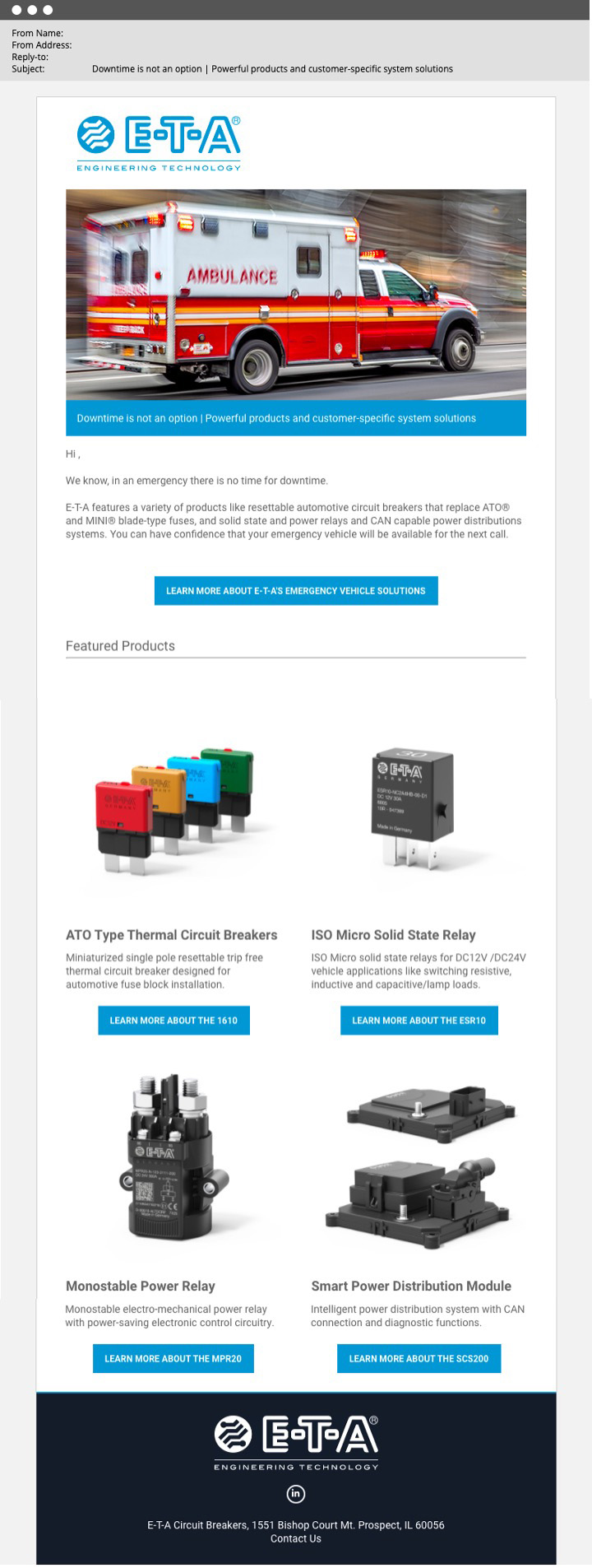 E-T-A offers standard industry specific email that you can send to your contacts. Just fill in the form to the right and an E-T-A branded email promoting industry specific products and content will be sent to your contact. The following emails are available. Click on the thumbnails below to see an example of each email.