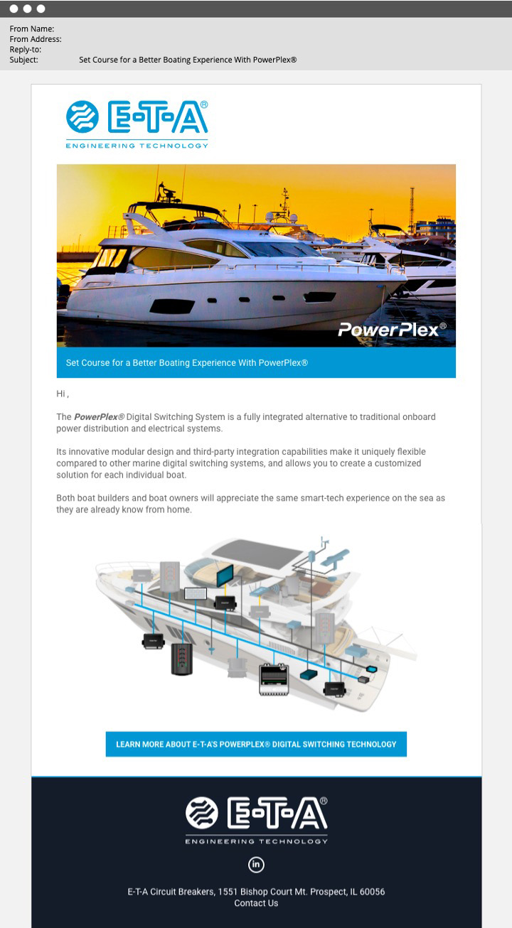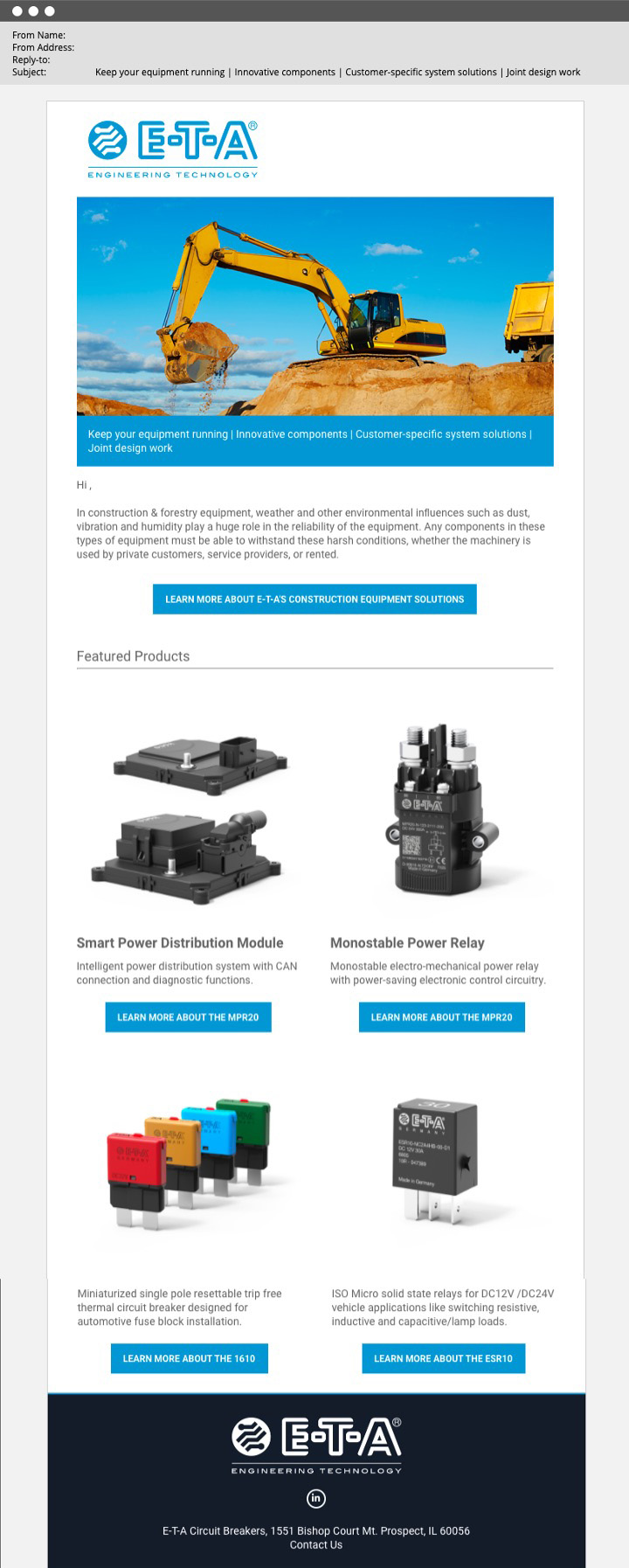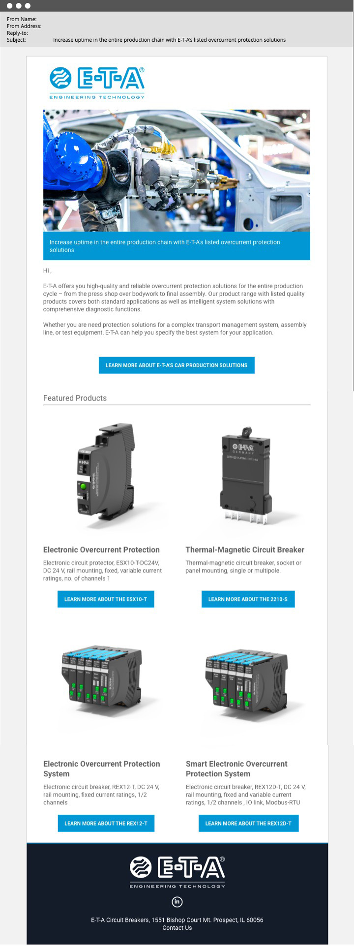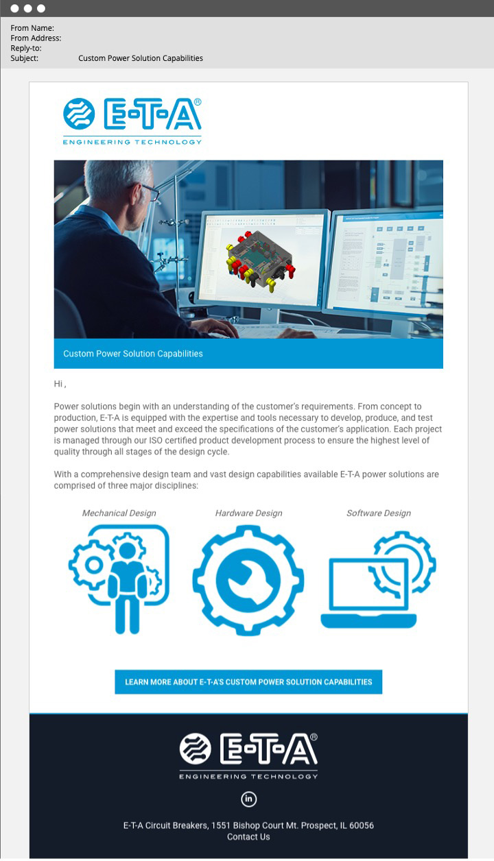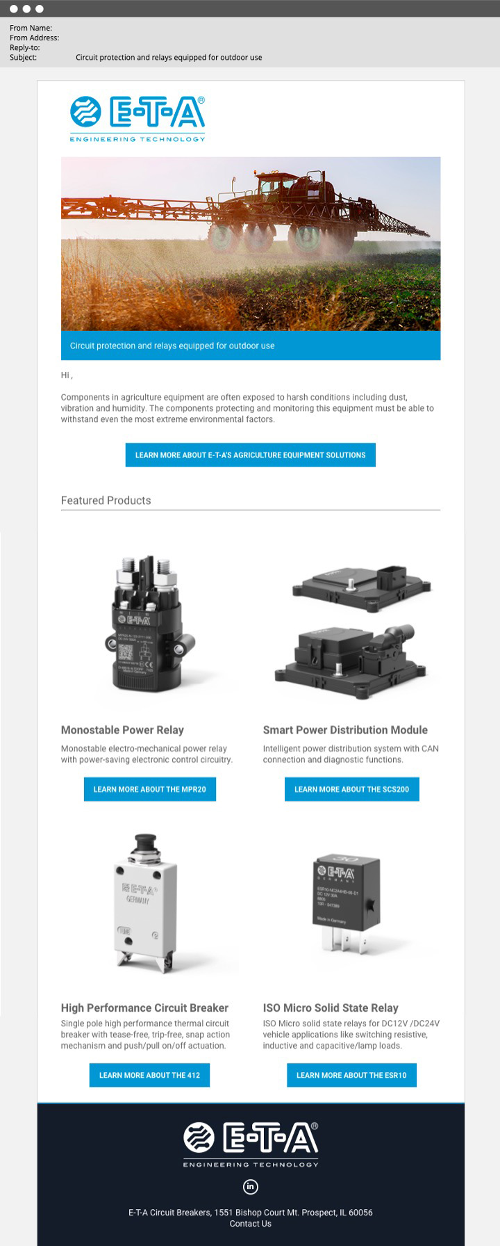 E-T-A offers standard industry specific email that you can send to your contacts. Just fill in the form to the right and an E-T-A branded email promoting industry specific products and content will be sent to your contact. The following emails are available. Click on the thumbnails below to see an example of each email.